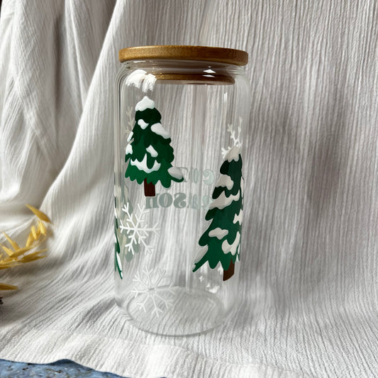 Glas-Trinkglas „Cozy Season Winter“ – mit Holzdeckel & Glasstrohhalm