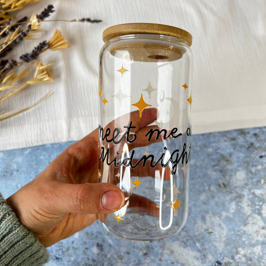 Glas-Trinkglas „Meet me at Midnight“ – mit Holzdeckel & Glasstrohhalm