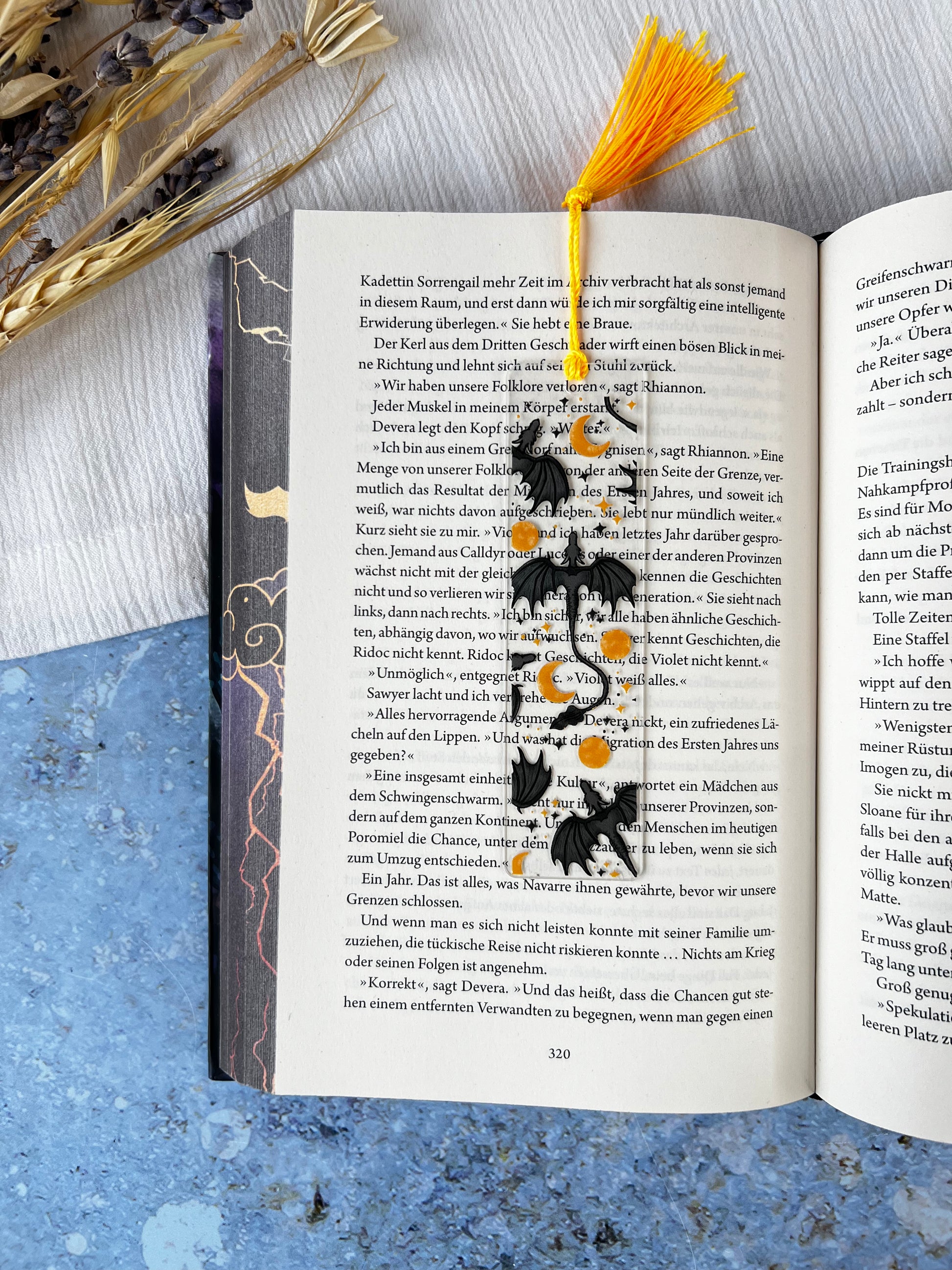 Tauche ein in magische Leseabenteuer! Das Acryl-Lesezeichen „Lunar Dragon Dreams“ kombiniert robustes Acryl mit farbiger Quaste und einer hochwertigen Trägerfolie – perfekt für Romane, Journals oder Notizbücher. Ein Must-have für alle, die Fantasy, Drachen & zauberhafte Momente beim Lesen lieben. 🌙📚