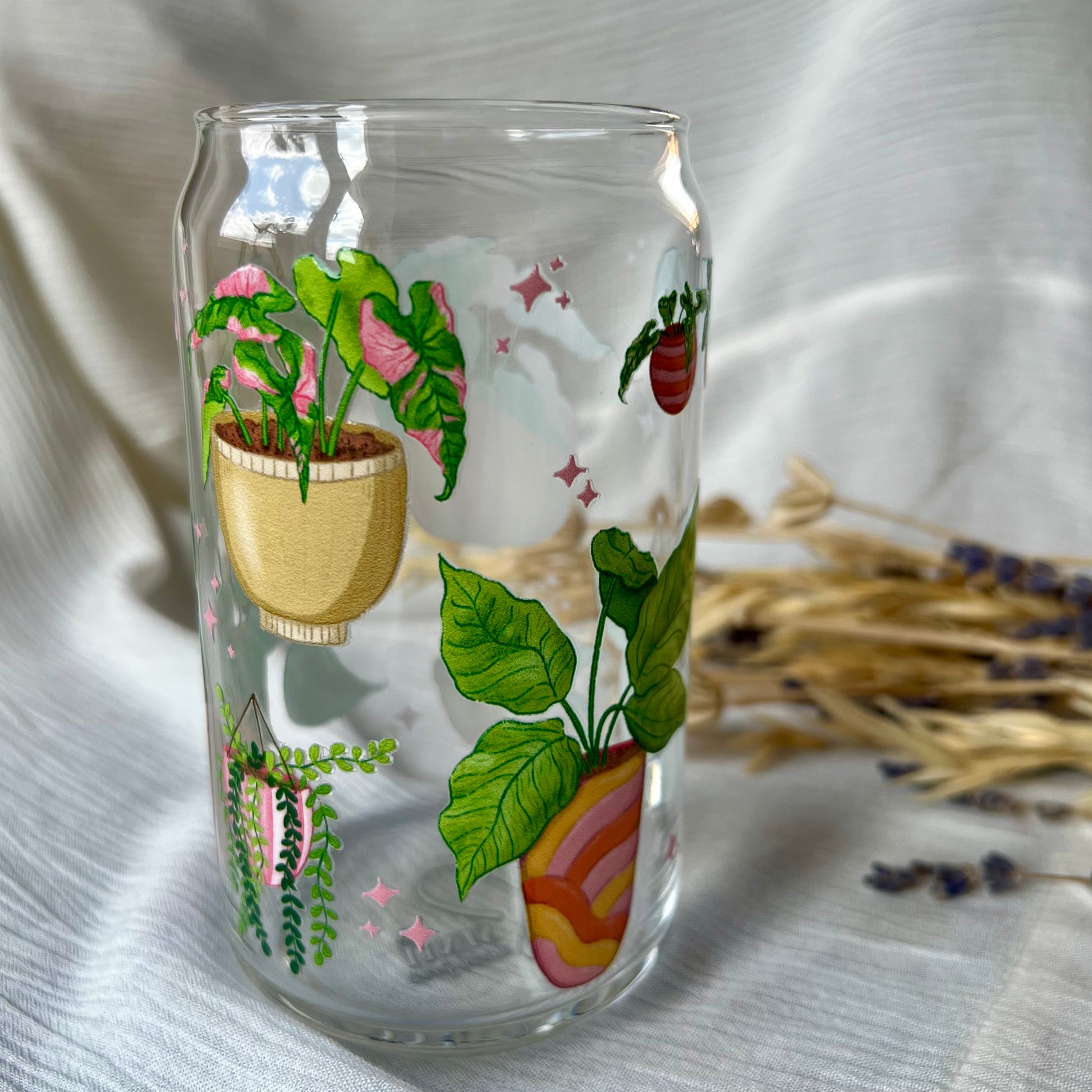 Do you love plants? Then our "Plant Parade" designer glass is just right for you! This high-quality 470 ml glass was made in France and finished with a durable UV DTF foil sticker from Germany. The design features a colorful parade of plants in colorful pots – including alocasias, calatheas , and other favorites from the plant world.
