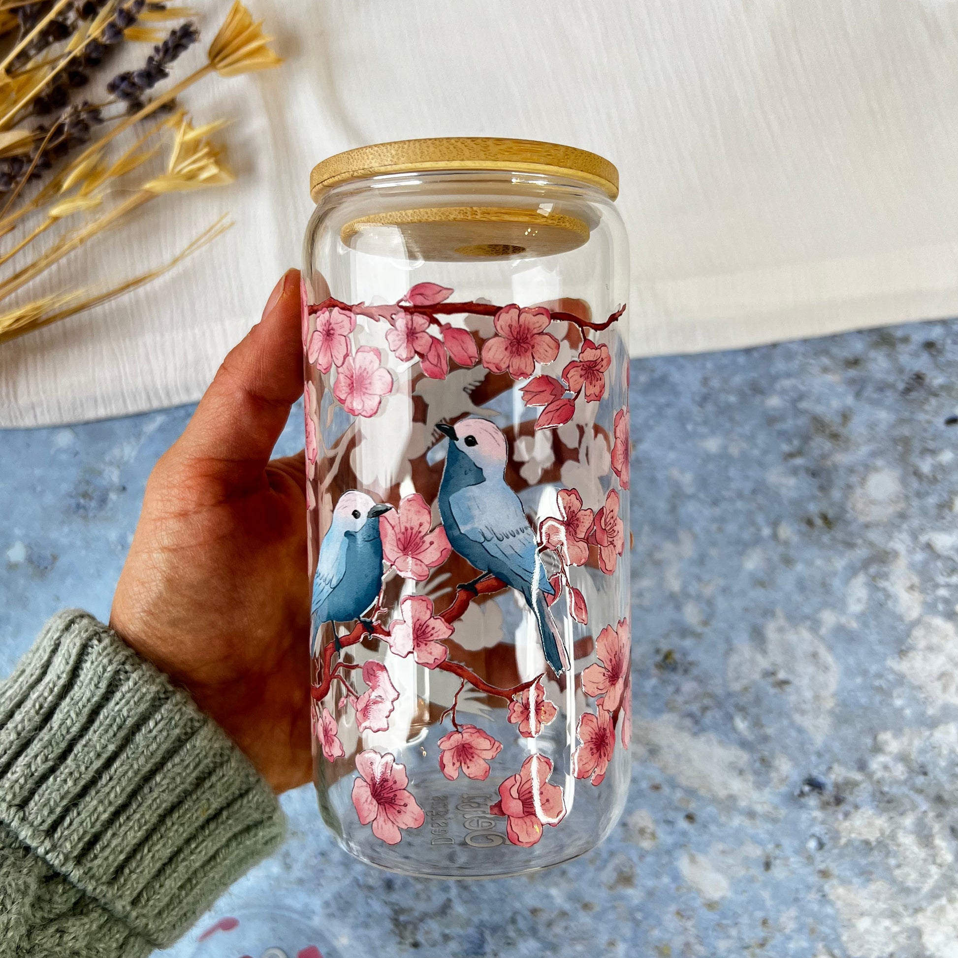 🥤 Glas-Trinkglas „Cherry Blossom“ – mit Holzdeckel & Glasstrohhalm | Elegantes Kirschblüten-Design 🌸🕊️