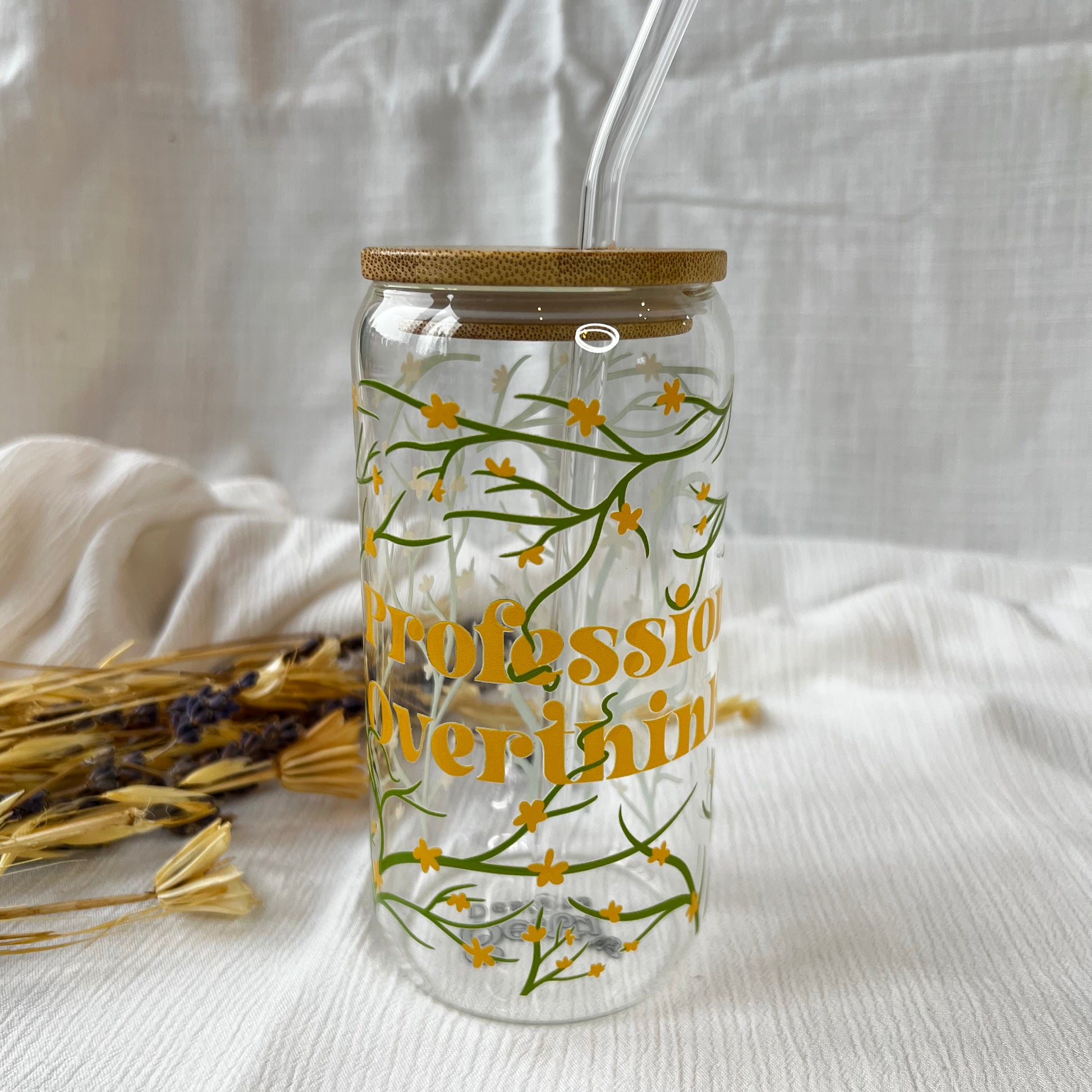 🥤 Glas-Trinkglas „Professional Overthinker“ – mit Holzdeckel & Glasstrohhalm | Lustiges Statement-Glas für Coffee & Tea Lovers 🌼☕