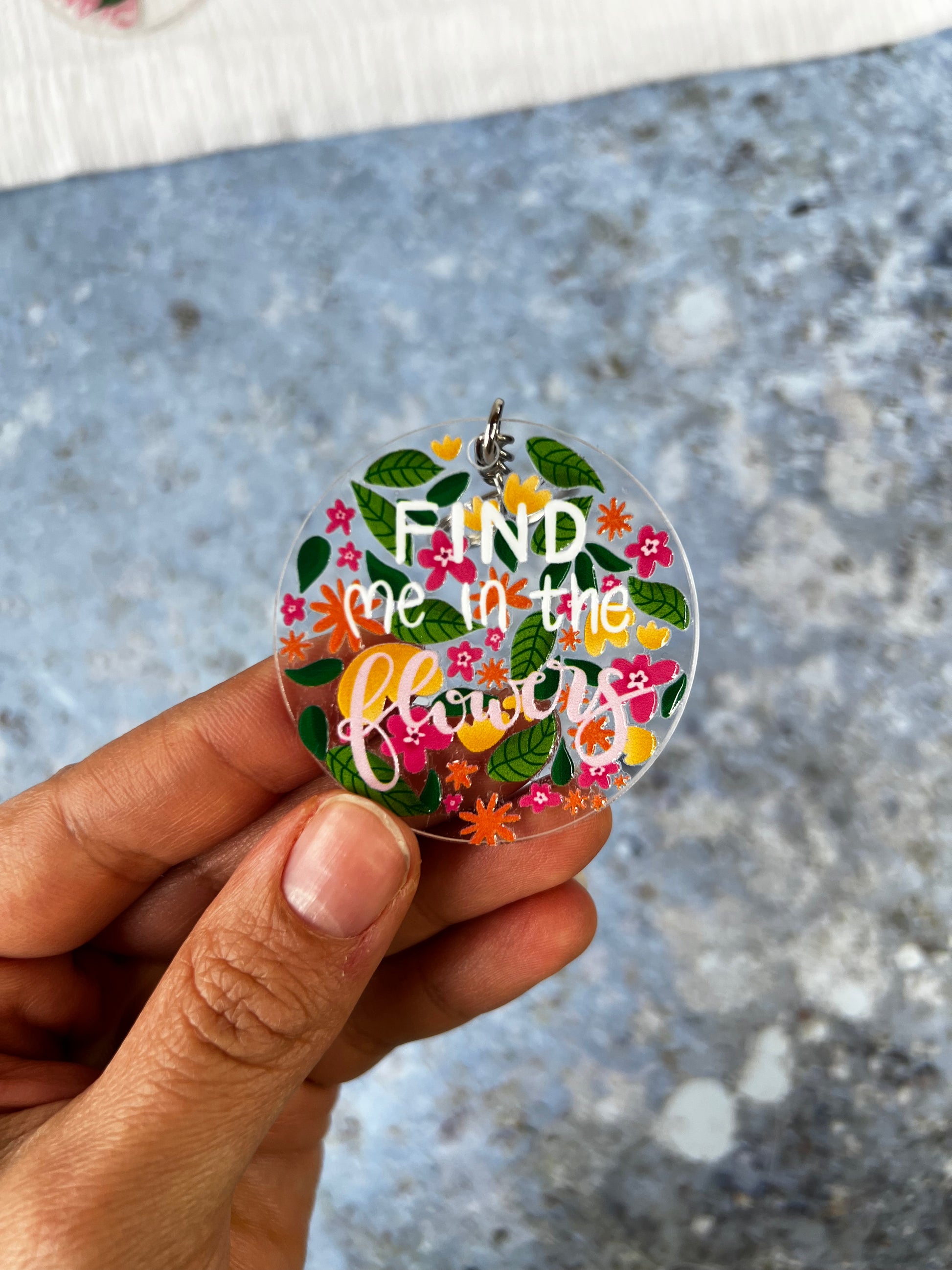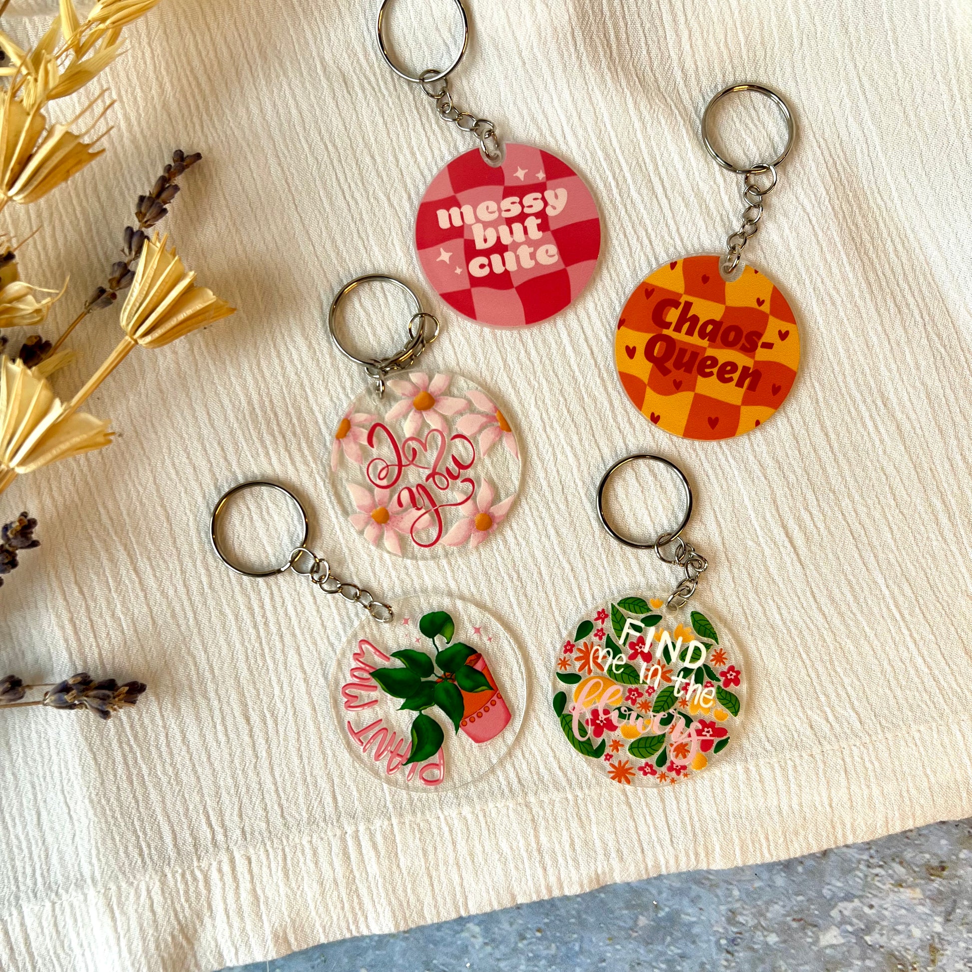 Setze farbenfrohe Statements überall hin! Unsere runden Acryl-Schlüsselanhänger (5 cm Durchmesser) kommen in vier zauberhaften Designs: